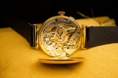 詳細を全部見るCalibre:339(ユニバーサル社製エボーシュ) Movement:手巻き / Hand Wound Case:18KYG,40mmStrap: SOLAKZADE Original (ソラックザーデオリジナル アリゲーター) Officer's Watchは、言わば腕時計の原点であり、腕時計そのものの歴史に深く関係するものだ。というのも、初期の腕時計がそもそも懐中時計、あるいは女性用のペンダントウォッチを手首に固定して使ったことにある。世界初の量産された腕時計は1880年頃ドイツ皇帝ヴィルヘルム1世がドイツ海軍将校用にジラール・ペルゴ社に2,000個の腕時計を製作させたものであるといわれている。そしてとりわけ第一次世界大戦中、将校たちがこうした懐中時計などをベースにした時計を手首に着け始めた。塹壕戦と砲兵運用には精密な時刻管理が不可欠で、将校は素早く時刻を確認する必要があった。世界初の量産腕時計(ジラール・ペルゴ製、セイコーミュージアムより)上着のボタンを外し、懐中時計を探す手間を省けることは、文字通り命に関わる利点だった。手首を一瞥するだけで時間が分かり、その間も戦場の危険から目を離さずに済む。そして20世紀初頭において時計を所有できるのはなお「将校階級の特権」に近かったため、こうした懐中時計をベースにした腕時計をOfficer's Watchと呼ぶようになったと言われる。今回は、有名ブランドではないが、Officer’s Watchという腕時計の原型を残した一本である。 Le Saleveはこの時期のスイス製によく見られる無名のメーカーの一つで、数少ない資料によれば、Blum & Ostersetzer SAというメーカーがイタリア国内向けに製造していたモデルに使用していた名称で、イタリア国内のロンジンの総代理店も手掛けていたという。そして、Le Salève は複数のブランド名を使い分けていた中の一つで、他に Alba Watch Co、Chronometro Polare、Eccoなどが含まれる。また、クロノグラフを比較的得意としていたようであり、ヴァルジュー製のエボーシュを主として製造していたとされる。 コレクターや愛好家にも知られていないメーカーではあるものの、この個体は希少なユニバーサル社製のエボーシュを搭載しており、そのムーブメントの状態も良好。また、この個体は個体番号から推測するに、1930年代後半から1940年代初頭にかけて製造されたと考えられる。このワイヤー型のラグと、ダブルヒンジ、そしてエナメルダイヤルというクラシカルなデザインは、正に1920から30年代にかけて将校たちが好んで着けたOfficer’s Watchを彷彿とさせる。 この個体はパテックフィリップのRef.96のような現代の腕時計のデザインが普及しつつあった時代に、あえて古典的なデザインで製造されたという意味で、当時のイタリアの伊達な愛好家に向けた時計だったのかもしれない。