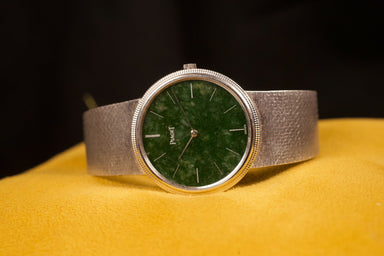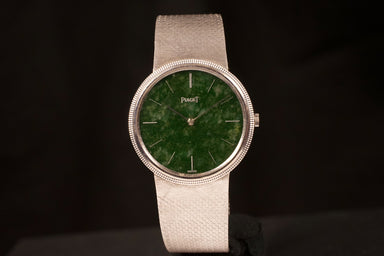 1970年代、ピアジェが制作した翡翠ダイヤルのAltiplano。石そのものの深みを文字盤に落とし込んだ、静かなラグジュアリーを体現する一本である。