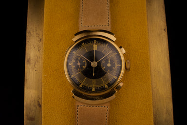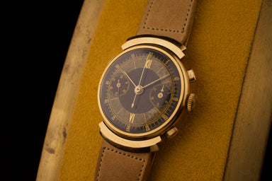 Calibre: Landeron 13 Movement:手巻き/ Hand Wound Case:18KYG 無銘のクロノグラフ。 1930年代の後半に製造されたと考えられる。 無銘ではあるものの、特徴的なフーデッドラグや、クロノグラフでは珍しいローマ数字、そして抜群の状態を誇るギルトダ...